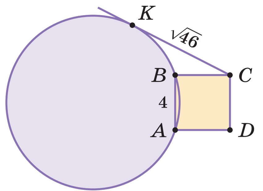 Задача: Сторона AB квадрата ABCD равна 4 и является хордой окружности, причём остальные стороны квадрата лежат вне этой окружности. Отрезок касательной, проведённой к ней из точки С, равен √46. Найдите диаметр окружности. ©Математическая Вертикаль. Учебное пособие для общеобразовательных организаций. Автор: М.А.Волчкевич. Решение: Продолжим BC до пересечения с окружностью в точке E(см рисунок) По теореме о квадрате отрезка касательной BC * EC = KC^2 ⇒ 4 * EC = 46 EC = 46/4 BE = EC - BC = 46/4 - 4 = 30/4. ∠ABE = 180° - ∠ABC = 180° - 90° = 90° ⇒ AE - диаметр и △ABE - прямоугольный. В прямоугольном △ABE по теореме Пифагора AE^2 = BE^2 + AB^2 ⇒ AE = √((30/4)^2 + 4^2) = √(900/16 + 16) = √(1156/16) = √1156/√16 = 34/4 = 8,5. Ответ: 8,5. Задача решена.