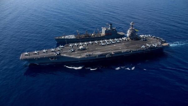 В прошлом китайские военные уже воссоздали на песке в комплексе в пустыне Такла-Макан несколько кораблей, построенных именно по американским типам. Последний пример, который сейчас вызывает ажиотаж, — это своего рода манекен или модель верхней части авианосца «Джеральд Р. Форд» в масштабе 1:1. Изображение: REUTERS / U.S. NAVAL FORCES CENTRAL COMMAN Новый объект был сфотографирован с околоземной орбиты компанией Planet Labs 1 января. На снимке видна черная, возможно, асфальтированная площадка, которая точно соответствует очертаниям авианосца США. Конструкция на корабле в форме башни стоит точно так же, как и на «Джеральде Р. Форде». Кроме того, были отмечены точные положения четырех авиационных катапульт корабля. Изображение: 2024 PLANET LABS INC.Вокруг модели авианосца расположены мачты, которые должны быть радиолокационными отражателями. Они должны точно воссоздать радиолокационную сигнатуру корабля. Общая конструкция может быть использована, в частности, для испытаний радиолокационны