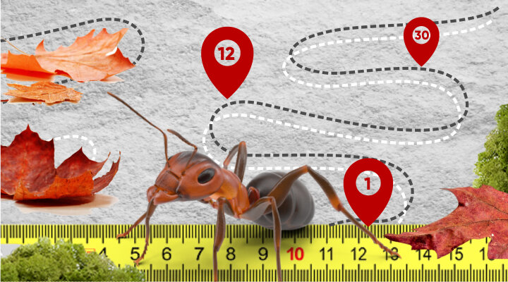 Муравьи - общественные насекомые, произошедшие от веспоидных ос в середине мелового периода около 150 миллионов лет назад. После широкого распространения цветковых растений, то есть около 100 миллионов лет назад, появилось множество разнообразных видов этих насекомых. Муравьи-бегунки вида Cataglyphis fortis из пустыни Сахара в поисках еды проходят огромные расстояния по песчаным ландшафтам, часто полностью лишённым каких-либо визуальных ориентиров. Эти существа способны возвращаться к своему гнезду по кратчайшему пути, вместо того чтобы идти обратно по собственному следу. Они не только умеют определять направление по солнечному свету, но и, по-видимому, обладают неким встроенным "компьютером"-шагомером, подсчитывающим количество сделанных шагов и вычисляющим по ним пройденное расстояние. Муравей-бегунок может пройти до пятидесяти метров, пока не встретит мёртвое насекомое, от которого он оторвёт кусочек и понесёт по прямому пути обратно в гнездо, вход в которое представляет собой отве