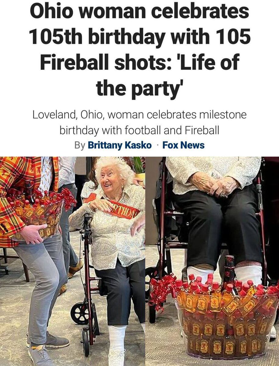Жительница американского штата Огайо Флоренс Хэкман в конце декабря отпраздновала свой 105-й день рождения и поделилась секретом долголетия и поддерживающего его оптимизма. По словам долгожительницы, помимо того, что она предпочитает заниматься приятными для себя делами, она также ежедневно выпивать порцию своего любимого сорта виски. Родившаяся в 1918 году Флоренс работала в страховой фирме, а свой очередной юбилей она отметила в окружении приятелей и персонала дома престарелых, где сейчас проживает. Молва о жизнерадостной старушке вышла за пределы учреждения, и о пожилой почитательнице виски узнали производители того самого бренда виски - Fireball. Компания решила поздравить свою преданную поклонницу, и в день 105-летия Флоренс получила в подарок ровно 105 небольших бутылочек любимого напитка. ✔️Подписывайтесь на наш канал в Дзен, чтобы не пропустить новые публикации! ✔️Приглашаем в наше сообщество во ВКонтакте! Подписывайтесь! ✔️Еще больше интересного в нашем канале в Те