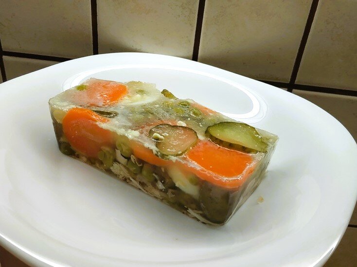 Это вариант заливного, которое не просто диетическое, но ещё и полезное, а главное — вкусное. По всем ингредиентам у меня получился полноценный салат "Оливье" с небольшим нюансом. Я так увлеклась процессом, что совсем забыла посчитать калории. Но одно могу сказать точно, что их здесь совсем немного. Вы можете взять этот рецепт на вооружение и самостоятельно просчитать калорийность по моему методу. Как я делаю холодец, я уже писала ранее. Принцип действий тут точно такой же. Сварим курицу и разберем ее на кусочки. После этого разложим их ровным слоем в контейнера. Необходимо измерить объем бульона, чтобы определиться с количеством желатина. Для заливного и холодца берут обычно 20-40 г желатина на 1 л жидкости. Если возьмете 20 г, то есть полученное блюдо нужно будет прямо из контейнера, поскольку оно будет "живым". Большей плотности можно добиться, если взять 40 г желатина на литр бульона. Тогда наш "Оливье" можно достать и нарезать на порционные кусочки. Замачиваем необходимое кол
