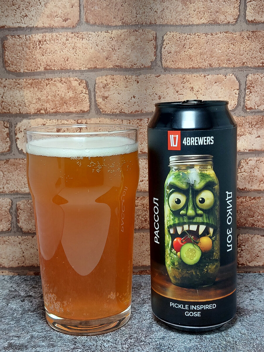 Перед нами томатное гозе, "вдохновлённое маринованными огурцами", от пивоварни 4BREWERS (ООО "Четыре пивовара") из города Владимир. Описание на сайте пивоварни идентично описанию на этикетке банки: "В мире, где даже самая обыденная вещь может изменить ход истории. Он был всего лишь приправой, но его злоба выходит за рамки банки. Все смеются над томатом, но только он знает, как по-настоящему разогреть обстановку. Наступает эпоха «Рассола»! Смотрите во всех барах страны. 18+ Насыщенный светлый кисло-солёный эль со вкусом и ароматом рассольных огурцов, томатов и специй." Плотность: 12%. Состав: вода подготовленная (исправленная), солод пивоваренный ячменный, солод пивоваренный пшеничный, огурцы свежие, укроп, петрушка, чеснок, томаты сушёные, соль пивоваренная пищевая, хмель прессованный, дрожжи пивные, сорбат калия (Е202). Рекомендованная температура употребления 7-10℃. Также пивовары на этикетке предупреждают, что вкус и аромат хмеля со временем становятся менее интенсивным и рекоменду