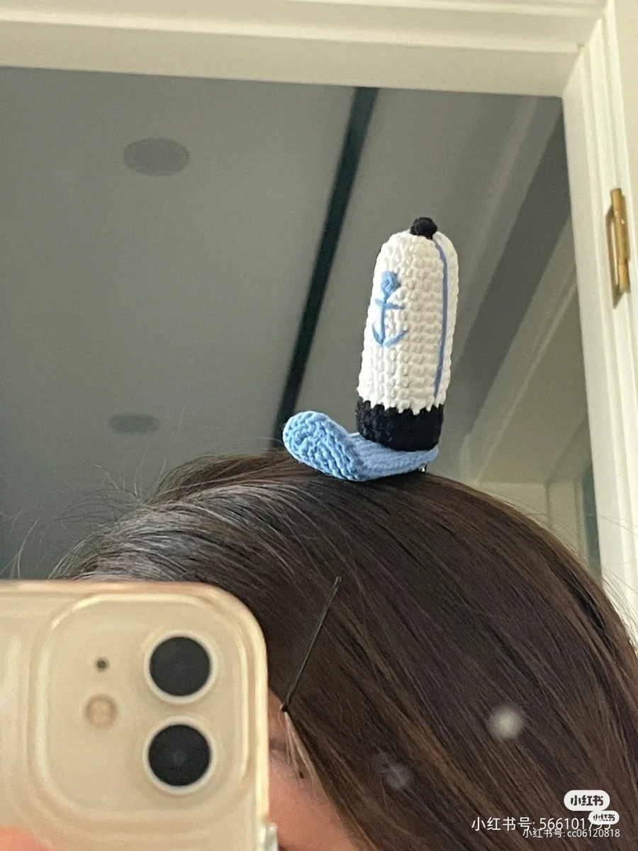 Заколка - шапочка сотрудника Красти Краба Корпус 1. белым 6сбн в кольцо 2. 6 пр 3. (сбн, пр)*6 4-15. 18сбн 16. (5сбн, пр)*3 17. (2сбн, уб)*5, сбн 18-20. черным 16сбн Поля кепки 1. синим 16 ВП, со 2 от крючка: 14сбн, 3сбн в 1 петлю, 13сбн, пр 2. пр, 13сбн, 3 пр, 13сбн, 2 пр 3. ввязать проволоку в этом ряду: сбн, пр, 13сбн, (сбн, пр)*3, 13сбн, (сбн, пр)*2 Связать 2 детали и сшить вместе Кнопка на кепке 1. 2 ВП, во 2 петлю: сбн Вышить полоски сбоку, вышить якорь. Пришить всё что пришивается.