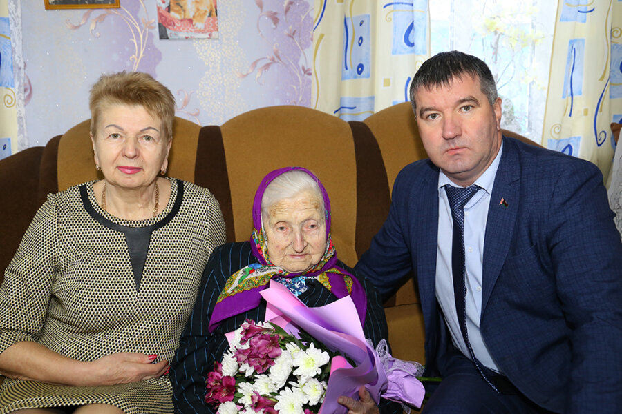 С юбилеем Елену Михайловну приехали поздравить гости из райцентра — председатель райисполкома Сергей Пилищик и председатель Совета ветеранов Людмила Каменко. Цветы и подарки — какой же праздник без них — пожилая женщина принимала с особой гордостью, ведь 100 лет — это тот рубеж в календаре жизни, которым действительно можно гордиться.