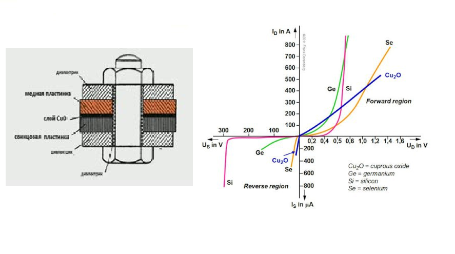 Существует ли в нашем подлунном мире идеальный диод? Который обладал бы линейной характеристикой, возможностью самовоссстановления, малыи падением напряжения p-n перехода? Да еще бы и делался на "коленке". Это так называемые купроксные выпрямители и фотоэлементы, которым 100 лет в обед. Первые известные твердотельные диоды по принципу действия сегодня именуемые диодами Шотки. Да они еще и плоскостные, а не точечные, что еще более увеличивает их ценность. Собираются в сборки и не требуют выравнивающих резисторов. Так почему сегодня практически не применяется это чудо? Элементарно - помимо очевидного функционально-стоимостого фактора, минитюаризация и идиотизм на фапание сверхвысоких частот делает свое черное дело. А в древности, в применениях которые были необходимы, они были просто идеальны. Делаются они весьма просто - горелкой нагревается медная пластина на воздухе до 1000 гр, а затем медленно остывает. Затем верхний слой смывается разбавленной азотной кислотой (помним что в алхимии