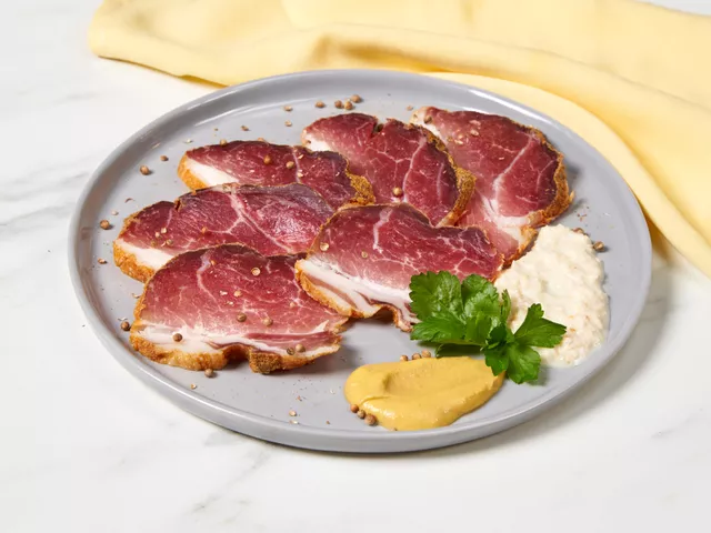 Охладите готовое вяленое мясо, нарежьте тонкими ломтиками и подавайте к столу с горчицей или хреном.