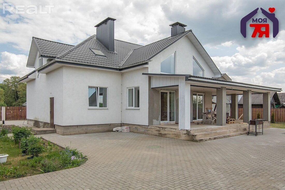 Общая площадь этого дома 272,8 м2. Он двухуровневый, с пристроенным гаражом. Построен в 2023 году из газосиликатных блоков. Фасад утеплен, оштукатурен и покрашен. На крыше – металлочерепица. Окна в доме энергоэффективные, в ламинированном профиле. Стены внутри оштукатурены, на полах стяжка.