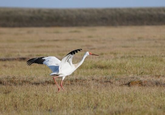 Стерх (лат. Grus leucogeranus) – представитель отряда журавлеобразных, семейства журавлиных, второе его название – белый журавль. Считается очень редким видом с ограниченным ареалом проживания. Описание Если смотреть на стерха издали, особых отличий не видно, но если рассматривать вблизи, то первое, что бросается в глаза – большие размеры этой птицы. Вес белого журавля достигает 10 кг, что вдвое превышает вес других птиц семейства журавлиных. Рост пернатого также немал – до полуметра в высоту, а размах крыльев до 2,5 метра. Отличительная его черта – голая, без оперения часть головы, всю ее, до затылка, покрывает красная тонкая кожа, клюв также красноватый, он очень длинный и тонкий, а его края имеют небольшие пилообразные зазубрины. Тело журавля покрыто белым оперением, только на кончиках крыльев черная полоска. Лапы длинные, полусогнутые в коленных суставах, красно-оранжевые. Глаза большие, расположены по бокам, с алой или золотистой радужкой. Продолжительность жизни стерхов – 70 лет,