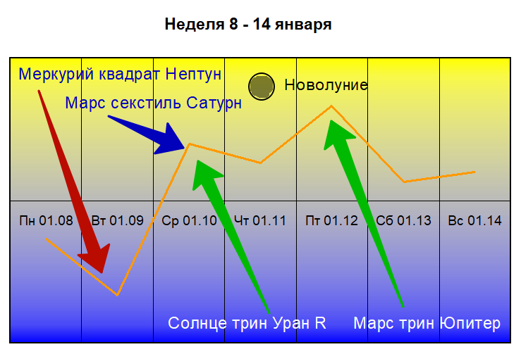 ГОРОСКОП ЗДОРОВЬЯ на НЕДЕЛЮ 8 –14 ЯНВАРЯ Внимание В прогнозе даются советы и рекомендации связанные с консервативным лечением. Не с хирургией, и тому подобными активными вмешательствами в дела организма. На это и следует ориентироваться в борьбе за здоровье. Луна в фазе способствующей борьбе с хроническими заболеваниями, вредными привычками, мониторингу скрытых заболеваний и подведению итогов в текущем Лунном месяце оздоровления до Новолуния 11 января. Не перенапрягайтесь физически и эмоционально. После Новолуния Растущая Луна способствует началу нового месячного цикла оздоровления. Настраивайте эту борьбу, пробуя новые методы оздоровления, лекарственные препараты, лекарства и упражнения. Это как бы «начало вдоха»… 8 и 9 января Луна в Стрельце. Прислушайтесь к скрытым, длительным заболеваниям кровообращения в основном в нижней части тела. Так же не забывайте печень, желчный пузырь и состояние мышц ягодиц и бёдер, внутреннего малого таза. Избегайте тяжёлой пищи и алкоголя, массажируйте