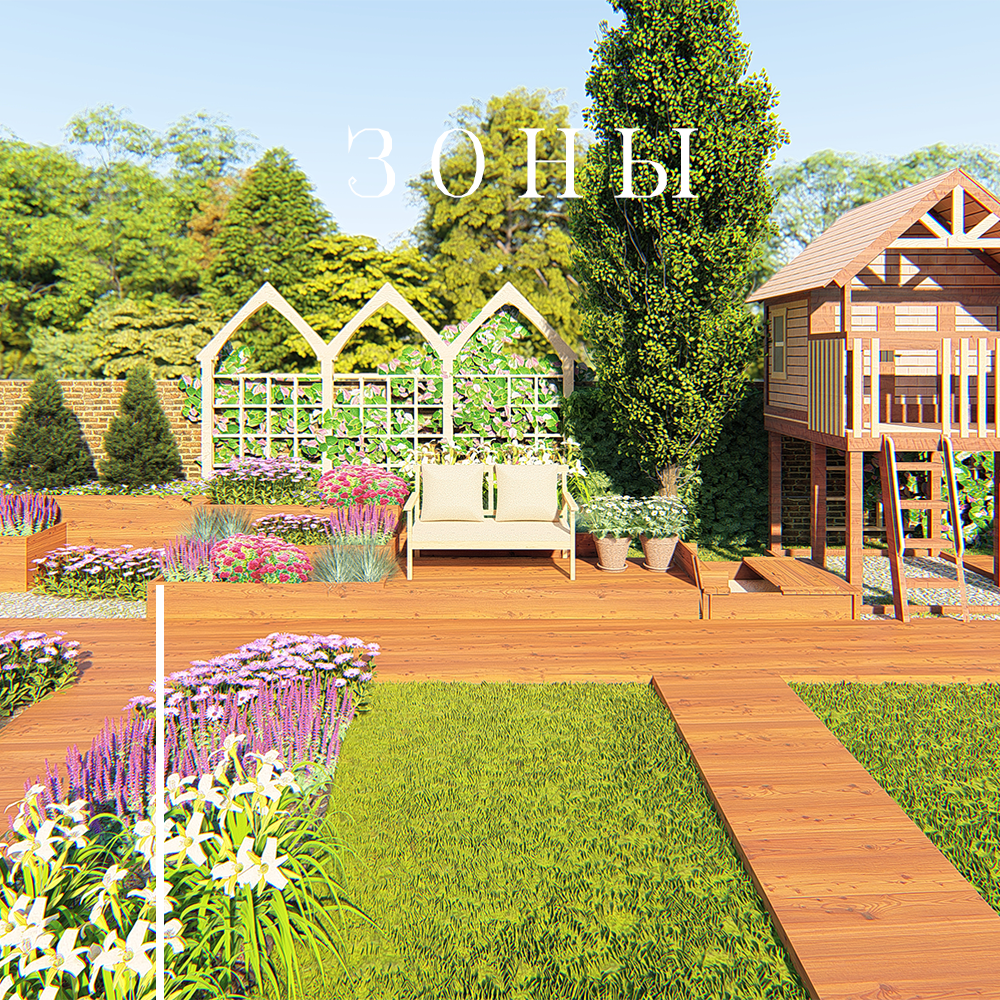 Описание: Если появилась идея отказаться от монолитного газона и выделить зону отдыха, этот вариант точно для Вас. Например, можно упростить процесс укладки брусчатки и сделать несколько деревянных настилов, которые бы вели из дома в зону отдыха. Ее можно со вкусом декорировать разноуровневыми высокими цветниками. На шпалерах у забора посадить Актинидию Коломикту, которую можно заменить и на девичий виноград, если регион размещения не позволяет. Пик цветения сада приходится на июль, в это время, так удобно расположиться на скамеечке в окружении цветущих многолетников и читать любимую книгу или журнал. Площадка спроектирована так чтобы Вам не пришлось высоко зашагивать на нее. Кроме того с этой точки удобно наблюдать как играют дети. Для детей в этом проекте задуман домик у