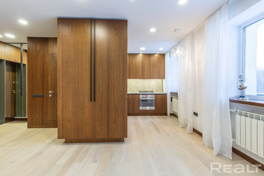 В этой компактной однушке на Коллекторной нет мебели, кроме кухни но ремонт выглядит как в современных ЖК. В хрущевке заменили все коммуникации и использовали хорошие материалы. Показываем эту квартиру в деталях. Эта хрущевка находится на одной из самых старых улиц Минска - Коллекторной, дом номер 32. Совсем рядом метро «Фрунзенская», до Немиги можно дойти минут за 15. Это кирпичная пятиэтажная хрущевка 1963 года. Капремонт был в 2005-м. Вот так выглядит дом. Рядом с домом - Еврейский мемориальный парк, близко поликлиника. Вот это место на карте. В квартире 30 квадратов общей площади. Небольшая шестиметровая кухня объединена с жилой комнатой, но в то же время, благодаря удачному зонированию, спрятана и не просматривается со входа. Столешница выполнена под мрамор, а кухонный гарнитур - из того же материала, что и встроенные шкафы и стеновые панели в квартире. Из техники в кухне есть посудомоечная машина Midea, холодильник и стиральная машина BEKO, газовая плита. В жилой комнате выход на