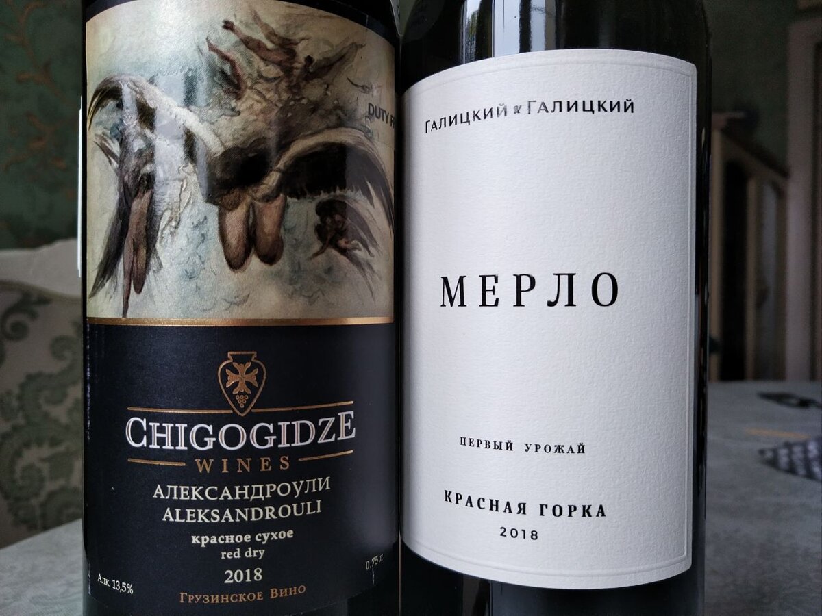 Оба вина 2018 года. Сравниваю александроули с мерло, так как непонятно, с чем, вообще, сравнивать александроули. Как вы понимаете, александроули - это премьера сорта в блоге. Я о нём даже и не слышал, пока не купил вино с такой любопытной картинкой в дьюти-фри. Повертел бутылку в руках, увидел, что сорт для меня новый, и не стал жалеть 2,5 тысячи. Наше вино, кстати, досталось мне дешевле, 1,6 тысячи, но три года назад. Сейчас оно стоит столько же, сколько такой вот Chigogidze в дьюти-фри аэропорта. Только сейчас в продаже другой год урожая. Мерло с Кубани существенно темнее по цвету, бордово-фиолетовое. Александроули из Грузии тёмно-красное полупрозрачное. Грузинское вино можно охарактеризовать как цветочно-джемовое. Розы и малиновый джем. Очень интересное сочетание, очень необычный аромат. ПРи игре в бокале мелькают сладкие травы. Вкус проще. Ноты те же, но без глубины, про танины ничего не записал. Послевкусие в наличии, интересное, продолжительное, но не мощное. Вино интересно не то