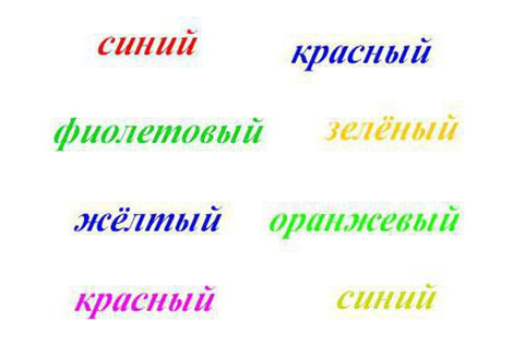 Возможно, многие уже знакомы с подобным занятием, его можно использовать в форме игры или как тест на внимательность. Суть проста. Взрослый предлагает ребёнку список цветов: красный, синий, зелёный, жёлтый, фиолетовый и т. д., но названия их написаны другим цветом. Например, слово «жёлтый» написано красным, «синий» - зелёным и т. д. Задача школьника - посмотреть на слово и сказать, какого оно цвета. Как может выглядеть упражнение, показано на нижерасположенном рисунке.