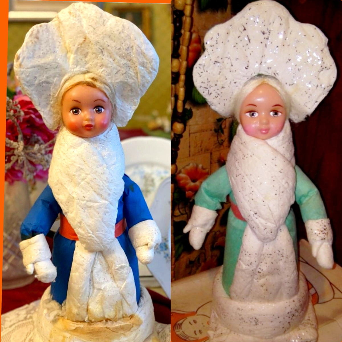 Посмотрите, какая очаровательная красоточка! Этих очаровательных созданий производила Пушкинская фабрика ёлочных игрушек в 1980-х годах. Высота игрушки составляет 32 см, а с кокошником — около 40 см. Она одета в ватную распашную шубку с поясом, под которой видно длинное платье, перехваченное поясом. Большой пушистый ватный воротник, манжеты и вся отделка искусно украшены блёстками. Шубка покрыта креп-бумагой разных цветов: красной, синей, жёлтой и зелёной. Ватные рукавички всегда белые. Пояс может быть любого цвета: красного, синего или зелёного. Особенно сказочно выглядит Снегурочка в белой шубке. Серебро блёсток выгодно оттеняет и дополняет белые оттенки, создавая атмосферу новогоднего волшебства.) Изюминкой игрушки является большой кокошник, который притягивает взгляд. Каждый раз он оформлен по-разному, одинаковых кокошников нет. Без него снегурка теряет большую часть своего обаяния, превращаясь в обычную куклу. Голова игрушки полностью кукольная выполнена из пластмассы.