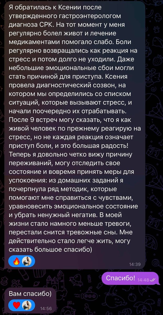 — в ситуациях, где стресс возникает, использует ряд техник, которые я рекомендовала делать, и живот также не беспокоит. Ее отзыв ниже: Записаться ко мне на консультацию можно в ВК (вот здесь) или заполнит