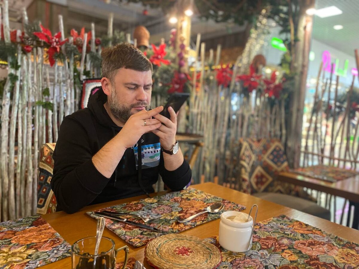 Столы сервированы пёстрыми вышитыми салфетками, приборами. На столе соль/перец/бумажные салфетки. Без внимания не оставались, Никита периодически подходил, спрашивал всё ли понравилось и чуть позже подозвал администратора помочь с установкой бонусной программы сети заведений.
