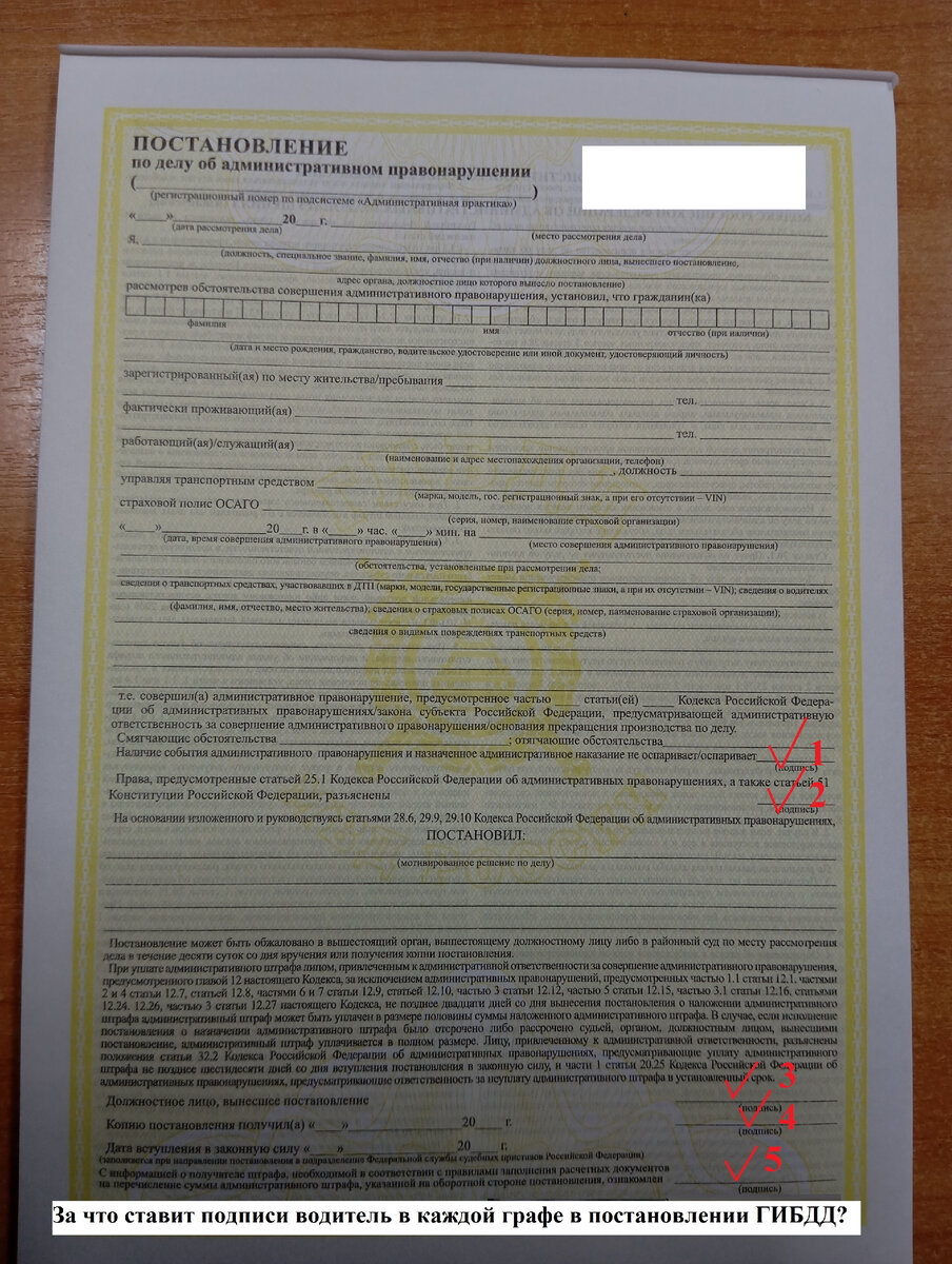 Автоюрист пояснил, для чего 5 граф для подписей в постановлении на штраф ГИБДД и за что водитель ставит подпись в каждой графе