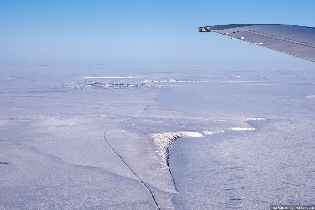 01. Анадырь стоит посреди бескрайней снежной пустыни. Вон, небольшое поселение. Вообще-то оно находится на берегу Берингова моря, но зимой это не сразу заметишь.