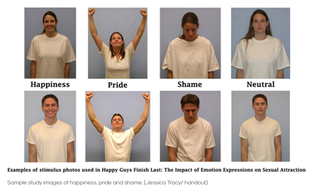 Согласно исследованию Университета Британской Колумбии, проведенного в 2011 году, женщины находят радостных и улыбающихся мужчин значительно менее привлекательными, чем самоуверенных или задумчивых. Тогда как мужчин наоборот, больше всего привлекают улыбающиеся женщины. В целом, это исследование показывает, что женщины и мужчины воспринимают и сексуально оценивают проявления эмоций по-разному, прежде всего это качается эмоций радости и счастья. Более 1000 взрослых мужчин и женщин в серии экспериментов оценивали сексуальную привлекательность изображений лиц противоположного пола с универсальными проявлениями счастья (лица с широкими улыбками), гордости (высоко поднятые головы, надутые груди) и стыда (опущенные головы с отведенными глазами). Исследование показало, что женщин менее всего привлекали улыбающиеся, радостные и счастливые мужчины. Испытуемые женщины предпочитали тех мужчины, которые выглядели сильными и гордыми или мрачными и стыдливыми. В то время как для мужчин наиболее секс
