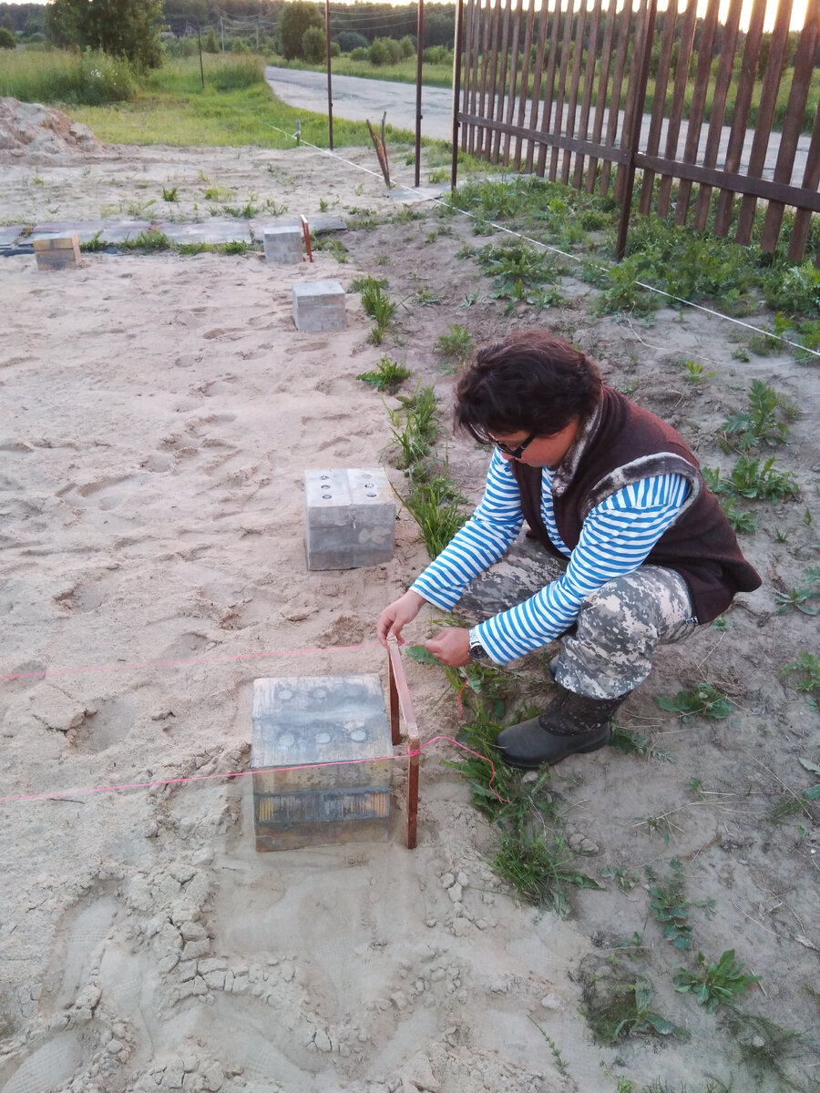 Дорогие друзья, всех приветствую! Добрый день, дорогие друзья! В 2017 году у меня появилась своя земля, для осуществления своей мечты. Первое, что необходимо было сделать, это расставить упоры на песковой подушке, которые были сделаны ещё весной из кирпичей. По-сути это и была закладка фундамента. Упоры должны были быть расставлены там, где шли узловые соединения бруса. Здесь возникла трудность, так как никак не могла я понять, как упоры расставить друг напротив друга. Все кривое, косое. Догадались потом посчитать диоганали, зная длину диоганалей, можно было выставить крайние упоры, ну а дальше уже легче, по размерам, по чертежу. Когда упоры были распределены - проверяем все плоскости упоров, чтобы они вместе создавали более менее ровную плоскость. Идеальных совпадений и ровности все равно добиться не получилось! Упоры выставлены, можно приступать к обвязке. Первым кладём брус 10*10. Брус кривой, что делать?! По незнанию, брус был куплен под счёт и не бревном больше, теперь, конечно ж