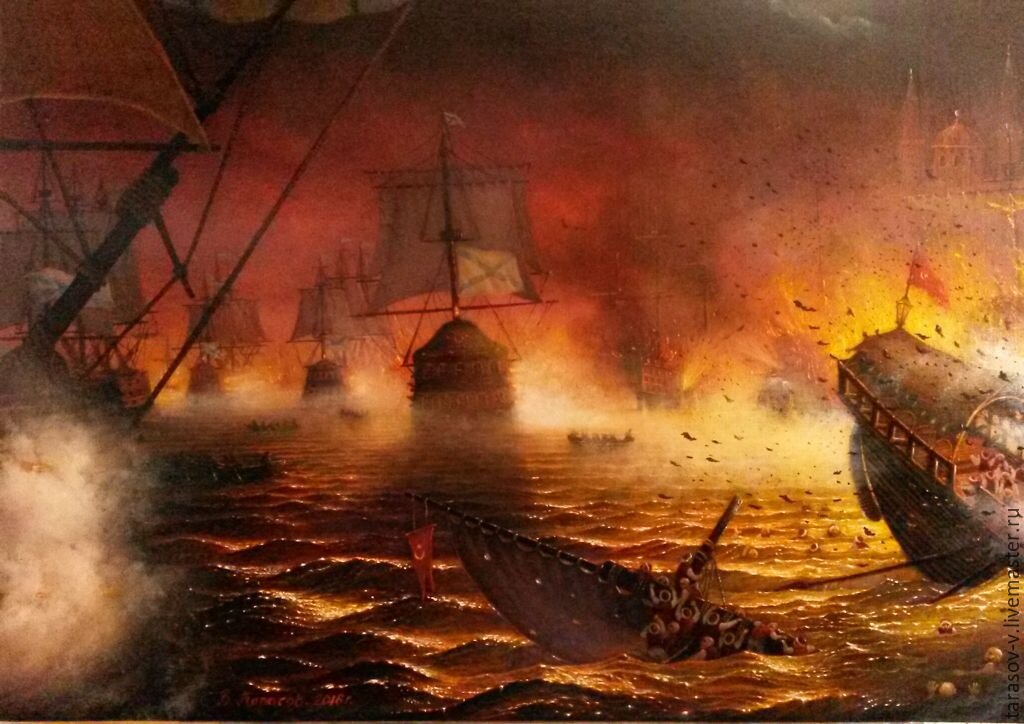 Чесменское сражение 1770 г. – морское сражение в Эгейском море у западного побережья Турции между русскими и турецкими флотами. Является одним из крупнейших сражений эпохи парусного флота. Оно делится на два этапа: первый этап – бой в Хиосском проливе 24 июня (5 июля); второй –уничтожение турецкого флота в Чесменской бухте в ночь на 26 июня (7 июля).