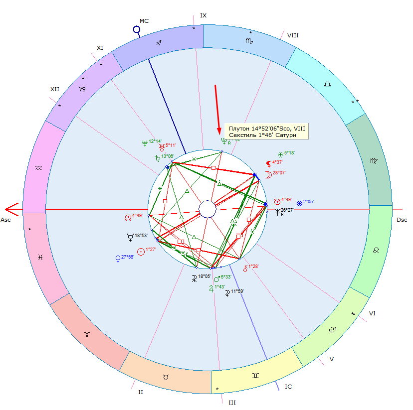 Найти планеты, которые в Скорпионе. В моем примере - это Плутон R в 15м градусе Скорпиона.