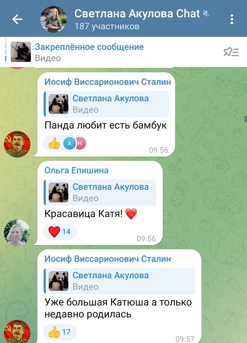 Милашка панда Катюша вызывает эмоции у всех. Ещё один аргумент в пользу кровавого диктатора. Посмотрел сегодня комментарии по поводу нашей малышки панды Катюши и обомлел: вождь народов не обошёл вниманием сей привлекающий внимание факт. Вот читаю комментарии к актуальной интформации о мимимишке и среди них: Иосиф Виссарионович Сталин, [6. 1. 2024 11:56] Панда любит есть бамбук Ольга Епишина, [6. 1. 2024 11:56] Красавица Катя! ❤️ Иосиф Виссарионович Сталин, [6. 1. 2024 11:57] Уже большая Катюша а только недавно родилась. Все мои статьи о пандах здесь Подписывайтесь, потому что самые острые статьи Дзен показывает только моим подписчикам.