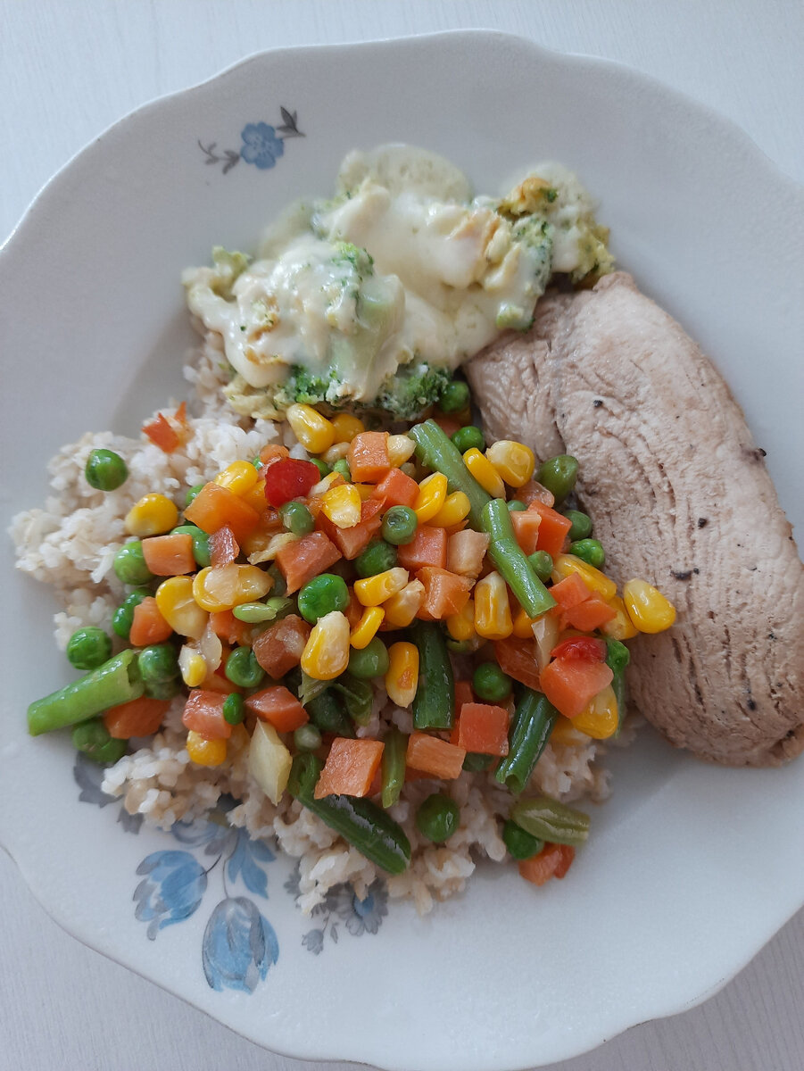 Моя постоянная рубрика с подборками завтраков, обедов и ужинов! #Обед 1 – бурый рис, стейк из индейки. Брокколи с яйцом и сыром. Замороженные овощи с топленым маслом. На сковороду нужно выложить замороженный брокколи. Я когда выложила, поняла, что тут огромные соцветия, которые нужно еще порезать, иначе все неравномерно будет готовиться. Затем на медленном огне под крышкой тушим минут 10, чтобы брокколи стало мягким, и ушла влага. В тарелке смешиваем 2 яйца, соль, перец, тертый зубчик чеснока. Я поленилась чистить и тереть. Добавила сушеный чеснок. Добавляем яйца к брокколи и мешаем, как на скрэмбл в течение минуты. Затем добавляю 50г тертого сыра. Накрываю крышку и жду, когда сыр расплавится. Я не люблю брокколи, но получилось вкусно! Ну еще бы, столько расплавленного сыра! Может тут дело не в брокколи, а в сыре?) Но, пожалуй, я так приготовлю еще))) Замороженные овощи с топленым маслом. Овощи выложила на сковороду, добавила чуть-чуть воды, поставила средний огонь, накрыла крышкой, и