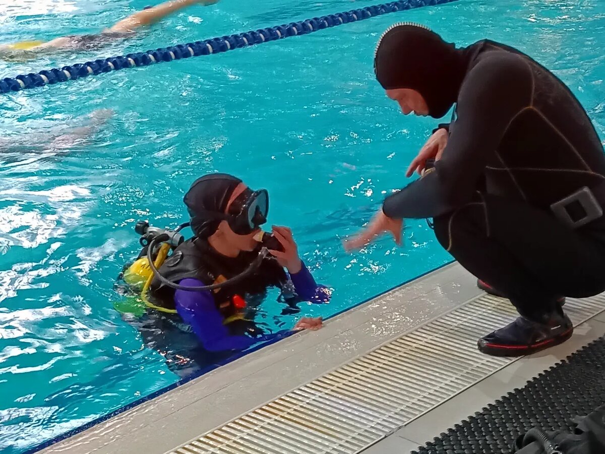 Настало время отоваривания подарочных сертификатов. Так сложилось что мы любим дарить друг-другу впечатления. Так я порулил самолётом (это прямо вау!) и катером, а Женя — снегоходом и полетала в аэротрубе. Этот Новый год не стал исключением — в небе жена чувствует себя неуверенно, поэтому освоение пятого океана решили отложить в пользу предыдущих четырёх. Начали в бассейне на Лодочной. Сегодня проходило пробное погружение: курсантке рассказали что такое акваланг, зачем все эти трубочки, как правильно пускать пузыри, что жест, в Германии воспринимаемый как «жопа», на самом деле имеет прямо противоположный смысл... Ну и поплавали среди купающихся, проверили теорию практикой. Со слов дайверши сначала было стрёмно, а потом очень даже здорово.