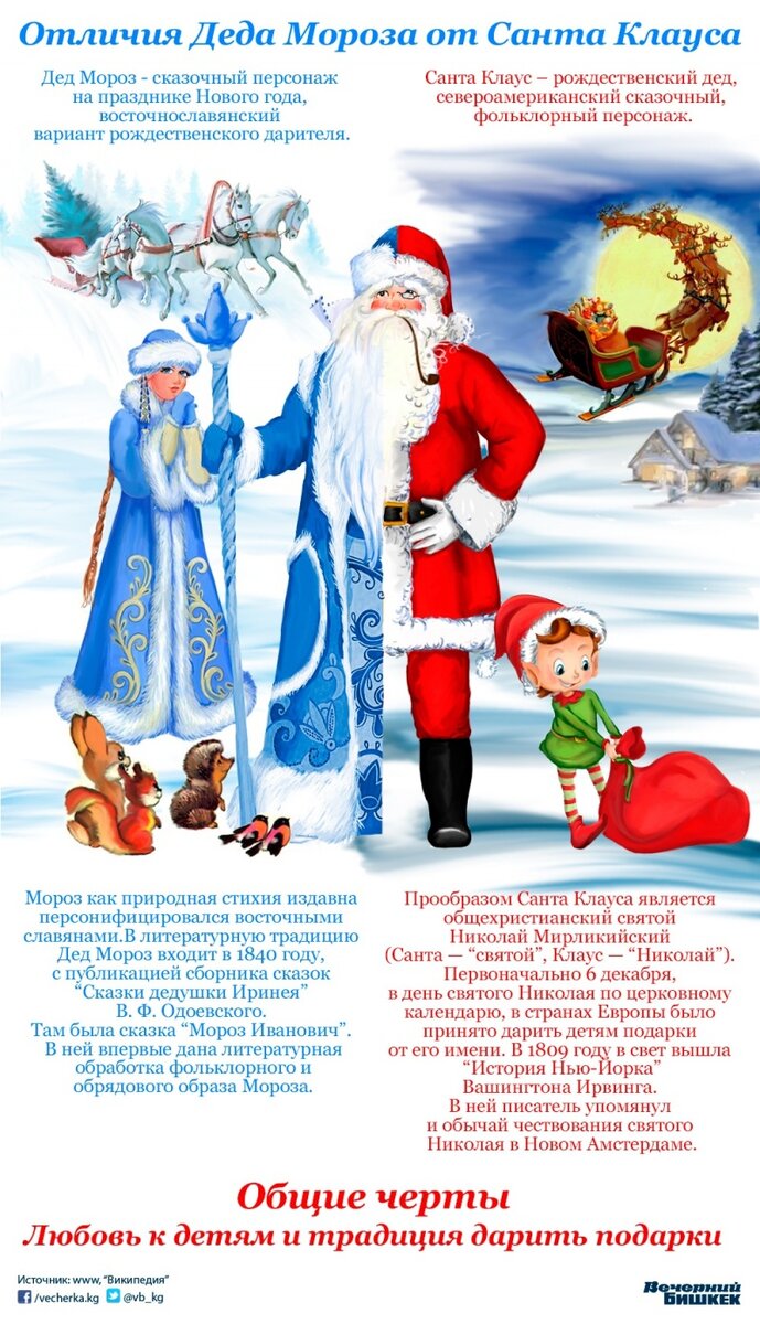 Почему у Санта-Клауса нет Снегурочки? Причин тому несколько. Во-первых прообраз Санта-Клауса святой Николай Чудотворец. Он был архиепископом, а архиепископам нельзя жениться. Жил он на территории современной Турции (какая там Снегурочка). Наш Дед Мороз дарит подарки в открытую на праздничных мероприятиях. Там Снегурочка является посредником между детьми и Дедом Морозом (например, подбодрить застенчивого ребёнка выступить). Кроме того, Деда Мороза могут подпоить и ему может понадобиться помощь, чтобы вернуться домой. А Санта Клаус залезает через трубу и тайком подбрасывает подарки в специально приготовленные чулочки у камина. В таком деле посредник между ним и детьми не нужен. Да и трудно представить себе Снегурочку, которая полезет в трубу. Кроме того Санта Клауса как-то не принято спаивать (Кока-Колу предпочитает), пьяненьким он не бывает, поэтому может добраться домой и сам. Правда Санта-Клаусу всё-же дали в подруги миссис Санта-Клаус, но она осталась малопопулярной (по сравнению с
