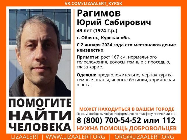 Поисковый отряд «Лиза Алерт Курск» распространил ориентировку на поиски исчезнувшего 49-летнего жителя Обоянского района Курской области. По данным волонтеров, пропал Рагимов Юрий Сабирович из города Обояни. Мужчина пропал 2 января 2024 года, его местонахождение неизвестно. Приметы: рост — 167 см, нормального телосложения, волосы темные с проседью, глаза карие. Одежда: предположительно, черная куртка, темные штаны, черные ботинки, коричневая шапка. Всех, кто может обладать какой-либо информацией о пропавшем курянине, об этом просят сообщить по номеру телефона горячей линии отряда 8-800-700-54-52 (бесплатно по РФ) или 112. Сергей Яшин, по материалам https://vk.com/lizaalert_kyrsk Постоянный адрес новости на сайте «Друг для друга» ~ https://dddkursk.ru/lenta/2024/01/06/104648/. Новости Курска за ~ 6 января ~ январь 2024 года.