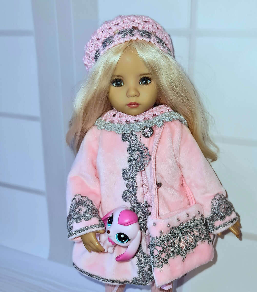Рассмотрим поближе мой самый любимый плюшевый наряд. Цвет - нежнейший розовый, отсюда и название "Зефирный зайка". В комплекте плюшевая шубка с отделкой серой вышивкой на сетке, шарфик, шапочка с отделкой кружевом, сумочка, платье из корейского хлопка с принтом в цвет, панталончики, чулочки, ботиночки из натуральной кожи и игрушка розовый зайка. Видео с примеркой наряда на Нельку (Little Darling) здесь: Интересно, как влияет наряд на кукол и как куклы влияют на него, это влияние определённо есть: красотка Бэль (художник Джойс Метьюс), к примеру. Ей надень хоть шапочку, хоть ушки. Она "детсадовским ребёнком" не становится. Наоборот, эта куколка превращает шуточные заячьи ушки в деталь костюма милого и даже изысканного розового кролика. А вот ООАК Paola Reina (Оленёнок, пока с таким именем) в шапочке - более взрослая "девочка", серьёзная. С ушкам же - детский сад, штаны на лямках. Такой тискательный зайчоночек, с ней хочется играть, переодевать, обнимать и радоваться. Какой образ мне