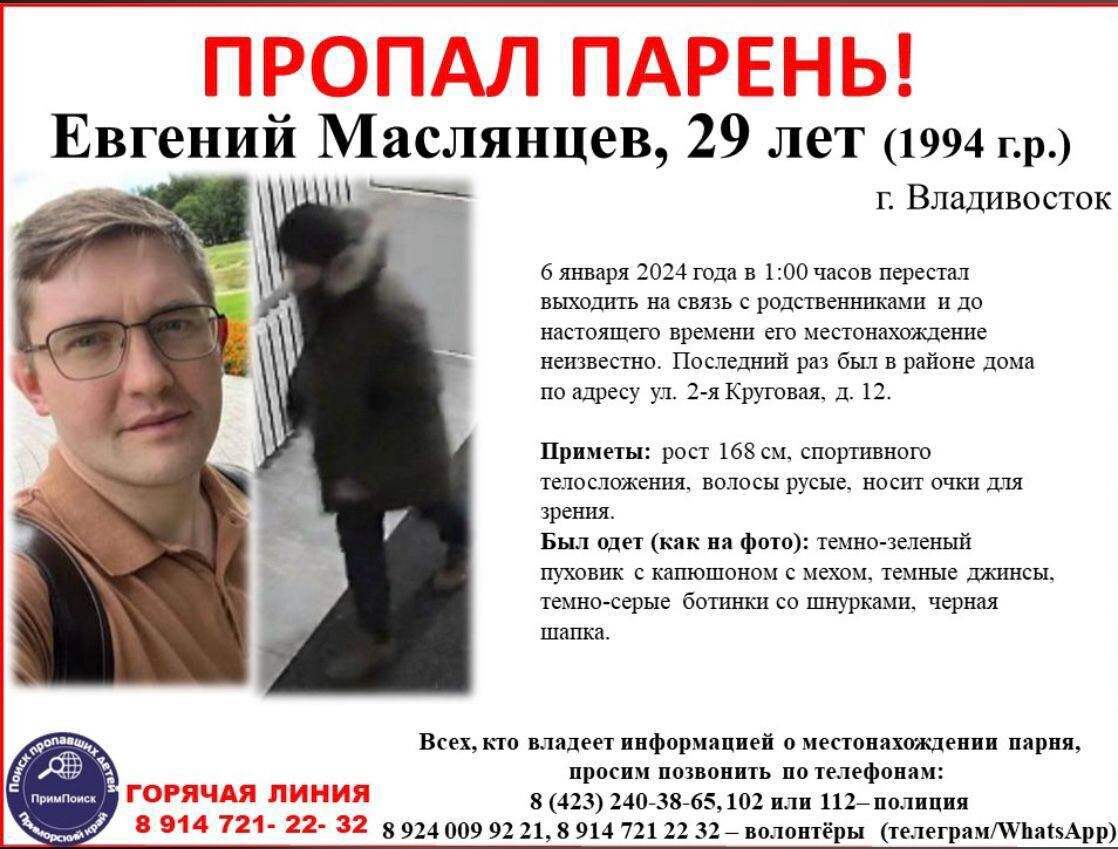 Ночью 6 января пропал хирург медцентра ДВФУ Евгений Маслянцев, 29 лет (1994 год рождения), житель Владивостока, сообщают "Вести:Приморье" со ссылкой на аккаунт "ПримПоиск" и владивостокские телеграм-каналы. Около часа ночи он вышел из бара на Светланской и поехал домой. Вероятно, уже дома он понял, что потерял телефон, ушёл его искать и пропал сам. В последний раз Евгений был на связи с родственниками в ночь на 6 января, 01:00, возле своего дома на 2-й Круговой, 12. Далее, по данным волонтеров и полиции, он был замечен по адресам Светланская, 9 и Океанский проспект, 9. До настоящего времени его местонахождение неизвестно. Приметы: рост 168 см, спортивного телосложения, волосы русые, носит очки для зрения.
