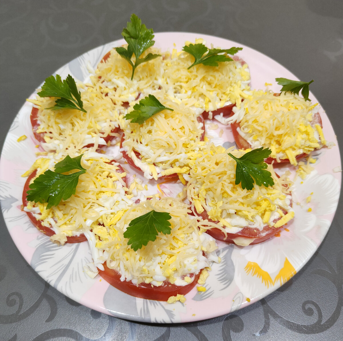 Ингредиенты: Приготовление : Помидоры нарезать кружками, не сильно толстыми и смазать майонезом с чесноком Сверху выложить натертое яйцо, можно посолить по вкусу и присыпать сыром На горочку выложить листик петрушки Закуска готова, быстро и вкусно! Приятного аппетита!