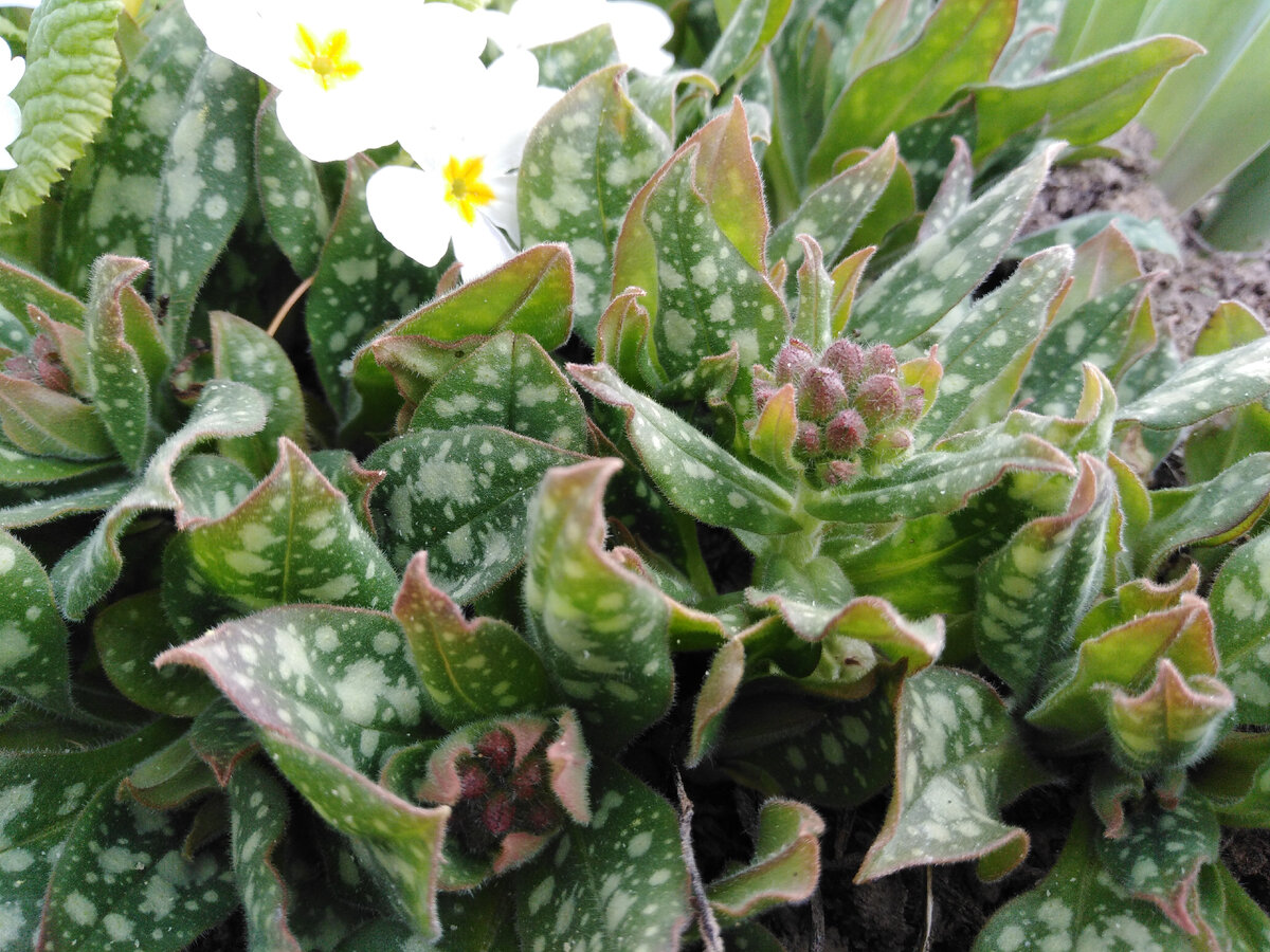 Медуница в моем саду есть, но всего одна и вполне обычная - с фиолетовыми цветами, меняющими цвет. Цветет в конце апреля-начале мая в цветнике первоцветов, под вишнями и сливами, оттягивая внимание шмелей от уже отцветающих примул.