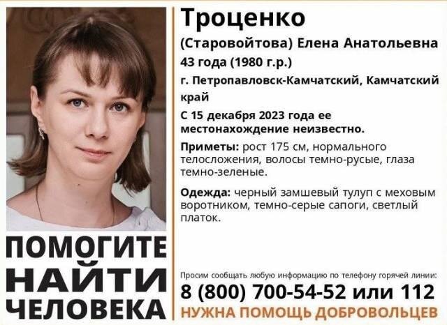 43-летнюю жительницу из Петропавловска-Камчатского разыскивают в Новосибирской области с середины декабря 2023 года. Поисковый отряд опубликовал запись об активном поиске 43-летней Елены Троценко из Петропавловска-Камчатского, которая пропала 15 декабря 2023 года. Предположительно она может находиться сейчас в Новосибирской области. В момент исчезновения Елена была одета в чёрный замшевый тулуп с меховым воротником, тёмно-серые сапоги и светлый платок. Всех, кто располагает какой-либо информацией о местонахождении пропавшей женщины, просят сообщить об этом по телефонам 112 или 8-800-700-54-52. Ранее Сиб.фм сообщал, что в Новосибирске начали поиски двух пропавших подростков.