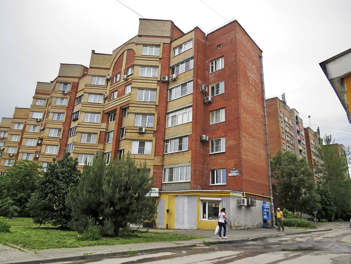 Напротив вытянулась сталинка, в 1950-х годах поглотившая дореволюционные дома Гавиха и Перушкиной. Со своей историей: в Гражданскую тут находился штаб Добровольческой армии и Вооружённых сил Юга России, в 1920-30-х - НКВД, а в послевоенные годы - Морской авиационное училище. С 1950-х за белым фасадом обитает "Миус" - разработчик промышленной электроники под эгидой местного вуза - Радиоинститута.