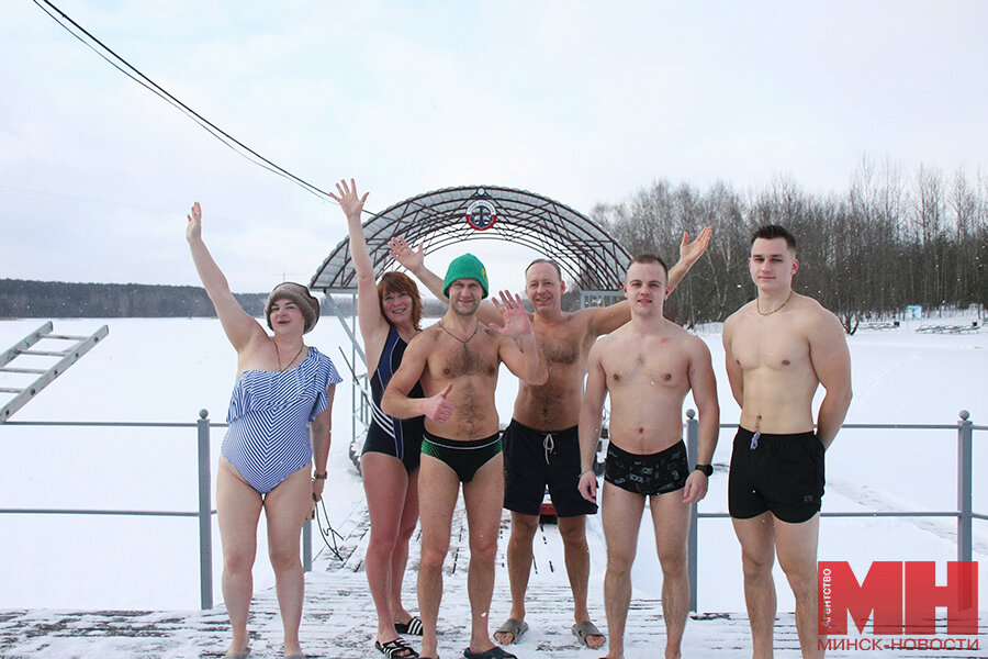 Эти ребята встретили рождественский сочельник бодряще: облачились в купальники и плавки, чтобы окунуться в Цнянском водохранилище. Корреспондент агентства «Минск-Новости» сходила узнать, как живут любители зимнего купания. На улице –8 °C, на заснеженном берегу водоема топится полевая баня, а возле проруби зажигательная разминка заканчивается погружением в ледяную воду. Однажды эти ребята объединились в сообщество «Моржи столицы». Сейчас их минимум 200 человек. — Сообщество организовал Дмитрий Мальковский. Место для окунаний выделил ОСВОД. Собираются единомышленники два раза в неделю по вторникам и субботам, — рассказал такой же любитель зимнего купания Дмитрий Разницын. За норадреналином ходит на водохранилище седьмой год. — Однажды решил расширить возможности человеческого мозга и сознания, чтобы извлечь максимум радости от жизни. Почему-то часто люди воспринимают зиму как нечто серое и спящее. За счет окунания я наслаждаюсь жизнью круглый год независимо от того, что за окном — дождь,