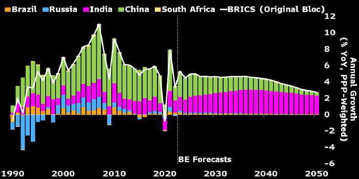 Кроме того, страны блока конфликтуют между собой, что не позволяет им добиться единства и сплоченности. Темпы роста ВВП отдельных стран БРИКС и всего изначального блока в % г/г (по ППС, исторические данные и прогноз Bloomberg Economics). Источник: Bloomberg Хронические долговые проблемы Китая и его экономическое замедление выступают серьезным препятствием на пути реализации амбиций БРИКС+. Успехи блока, наблюдавшиеся в последние десятилетия, были во многом обусловлены неимоверными темпами экономического роста в Китае, которые теперь быстро замедляются. Теоретически, Индия могла бы компенсировать часть этой просадки, однако ни ее экономика, ни политические амбиции, скорее всего, не окажутся столь же масштабными, как китайские. Есть у разросшегося до БРИКС+ блока и другие проблемы. Например, он лишен консенсуса и сплоченности. Отказ Аргентины присоединиться к БРИКС+ демонстрирует отсутствие единства на Глобальной Юге. У Индии есть тлеющий пограничный конфликт с Китаем, а Саудовская Арави