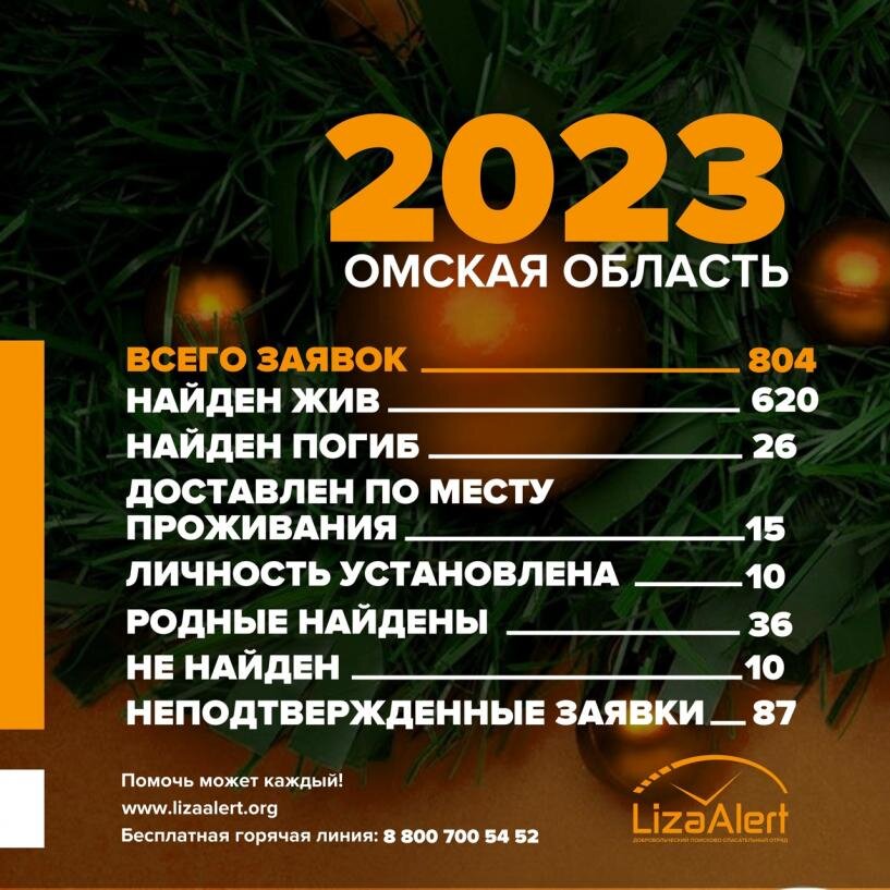 Омское подразделение поискового отряда «ЛизаАлерт» поделилось статистикой найденных людей. За 2023 год волонтёрам поступило 804 заявки. Живыми нашлись 620 человек. Погибли 26 человека. Бесследно пропали 10 человек. Ранее свою статистику также привёл другой поисковый отряд — «Доброспас-Омск». К ним за год поступило 463 заявки о пропавших людей, среди них 65 — дети. Волонтёрам удалось найти 38 человек, в том числе 5 детей. Отметим, иногда поисковики занимаются случаями, за которыми скрываются громкие преступления. Так, прошлым летом в Таре разыскивали пропавшую бесследно 36-летнюю женщину, мать двоих детей. Оказалось, что её зверски убил и расчленил муж. Читайте также на портале Om1.ru Разрубил лопатой: муж рассказал, как убивал свою жену в Таре Сегодня мы сообщали, что омская полиция объявила в розыск преступника, который может ночевать в подъездах. Читайте также на портале Om1.ru В Омске разыскивают преступника, который может ночевать в подъездах