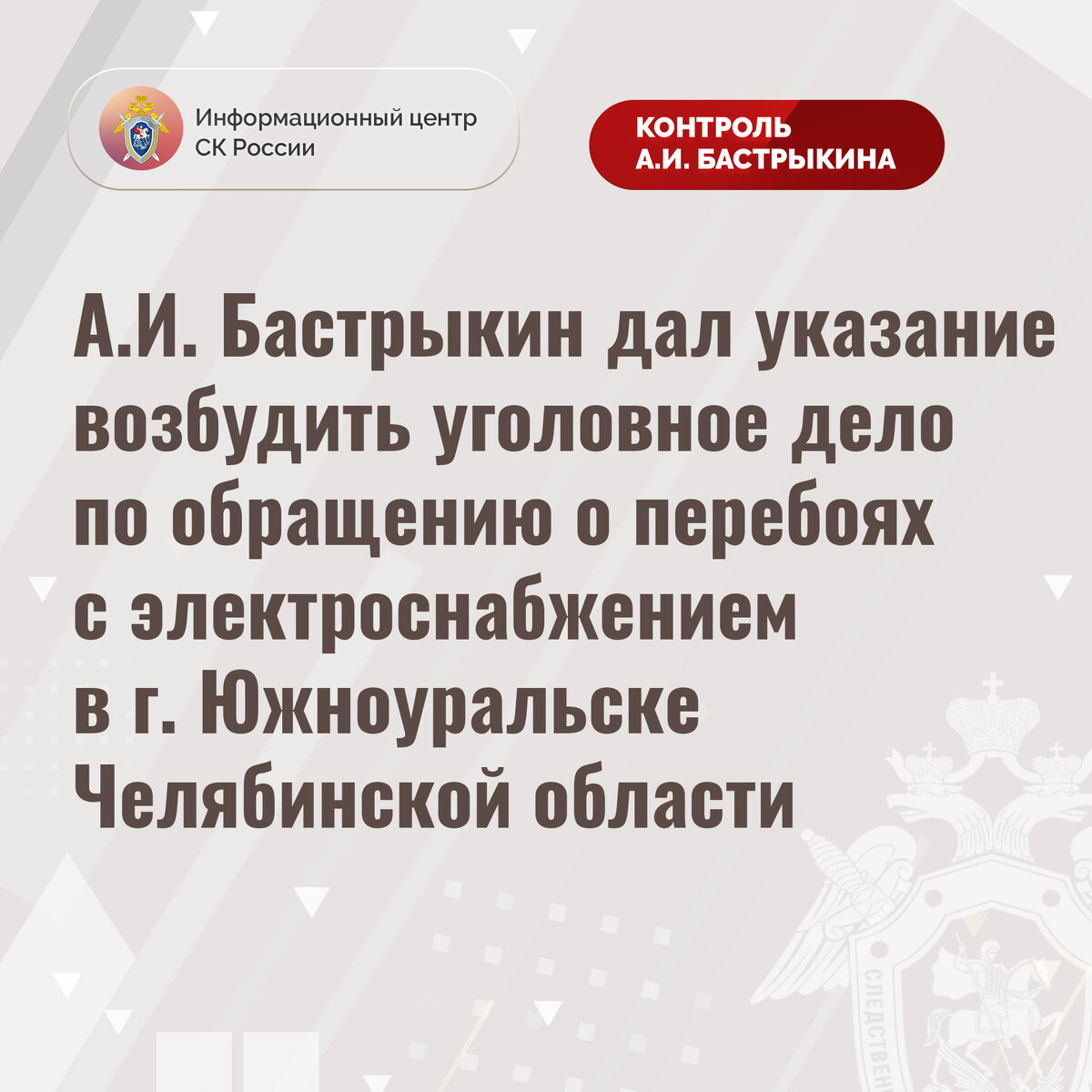 А.И. Бастрыкин дал указание возбудить уголовное дело по обращению о перебоях с электроснабжением в г. Южноуральске Челябинской области
