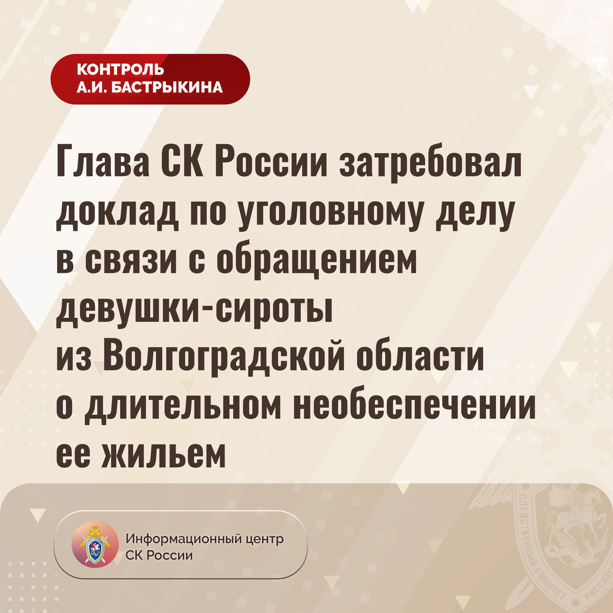 Глава СК России затребовал доклад по уголовному делу в связи с обращением девушки-сироты из Волгоградской области о длительном необеспечении ее жильем