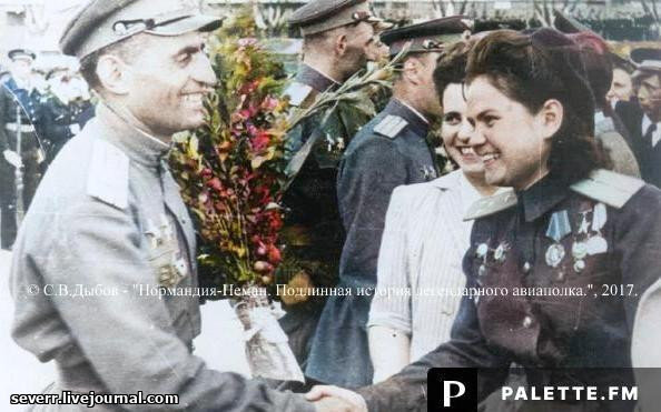 - Здравствуйте, я вас знаю. Мы вместе летали в Белоруссии. Я летчик из эскадрильи "Нормандия - Неман". Отвага девушек-летчиц вызывала у нас восхищение. Мы постоянно следили за вашей работой. Когда