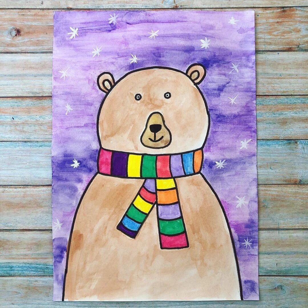 Пошаговый разбор рисунка. Для малышей может нарисовать взрослый контуры, а малыш раскрасит красками или карандашами. 1. Рисуем карандашом голову и туловище. 2. Прорисовываем шарфик, нос, уши, глазки. Обводим контур мишки чёрным фломастером. 3. Рисуем полосочки на шарфе. 4. Раскрашиваем шарфик. 5. Раскрашиваем мишу акварелью. 6. 7. Раскрашиваем фон акварелью. 8. Рисуем звезды. Наш чудесный Миша готов 👌🙂 Изображения взяты со страницы ВК