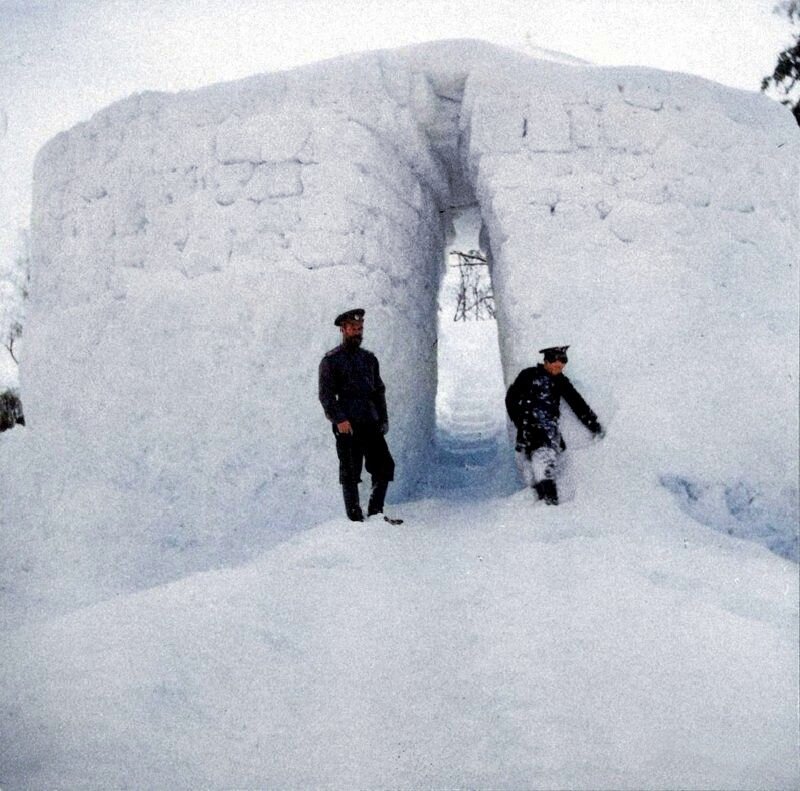 Надо сказать, что их времяпрепровождение не было чем то новым в Романовской семье, так происходило поколениями, и каждое новое поколение радостно отдавалось забавам своих предков, привнося что-то свое. Вот такие сооружения строили, а по другому это не назвать, каждую зиму недалеко от Александровского дворца в Царском селе. На фотографии Император Николай 2 и его сын, Цесаревич Алексей. А еще со снежных башен, как правило они были многоступенчатыми, это вы увидите на фотографии ниже, было очень весело прыгать в мягкий снег, причем прыгали все, даже Цесаревич Алексей. Уж не знаю как они на данном фото перебрались на Детский остров, с помощью электрического небольшого парома или водный канал вокруг дворца замерз, но тем не менее они сфотографировались на фоне детского домика, куда взрослым вход был воспрещен еще со времен детства маленького Императора Александра 2, их прадеда. На фотографии Великие княжны Ольга, Татьяна, Мария, Анастасия и Цесаревич Алексей. Так Детский остров и домик на