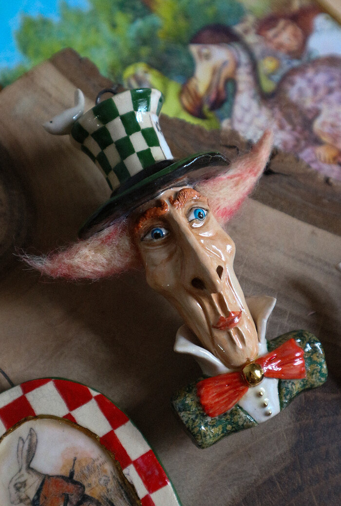 Привет! Я Света и я художник-керамист. Одно из моих любимых направлений - это ёлочные игрушки. К этому Рождеству мне хотелось сделать что-то особенное и я обратилась к Льюису Кэрроллу и его "Алисе в стране чудес". С радостью делюсь результатом с вами:) Безумный шляпник, Траляля и Труляля, белый кролик, Королева, чеширский кот и Алиса - все герои собраны в одной коллекции. Работа была в новинку ещё и в том смысле, что это, пожалуй, самые трудоёмкие и подробные игрушки из всех, что я делала. Это не первый раз, когда я обращаюсь к "Алисе" и каноническим иллюстрациям Джона Тенниела, кое-что можно посмотреть в предыдущем посте. Тема чрезвычайно благодатная, полная творческая свобода и никаких рамок кроме тех, разумеется, которые диктует собственный вкус. Можно сделать миллион разных вариаций и ни разу не повториться. Приятного просмотра! Керамика, глазури, пигменты, препарат жидкого золота. Керамика, глазури, пигменты, препарат жидкого золота. Керамика, пигменты, глазури, золото. Керамика,