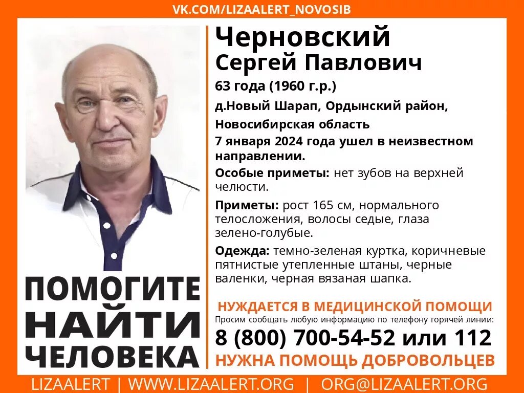 В деревне Новый Шарап Ордынского района Новосибирской области пропал 63-летний местный житель Сергей Черновский. Он не вернулся домой после ухода в неизвестном направлении 7 января. «На горячую линию отряда поступила заявка о пропаже мужчины 1960 года рождения. Ушел в неизвестном направлении 7 января этого года. Отрядом оперативно была распространена ориентировка в сети, 08 января с утра был объявлен сбор добровольцев на поиск, организован штаб», — рассказала НДН.инфо представитель поисково-спасательного отряда «ЛизаАлерт» Ольга Бобкова. Приметы Сергея: нет зубов на верхней челюсти, рост 165 см, нормальное телосложение, седые волосы и зелено-голубые глаза. Был одет: темно-зеленая куртка, коричневые пятнистые утепленные штаны, черные валенки, черная вязаная шапка. Всех, кто владеет информацией о местонахождении Сергея, просят позвонить по телефонам 112 или 8 800 700-54-52. Ранее мы писали, что в Новосибирске ищут женщину в длинной футболке и тапочках. Волонтеры бьют тревогу — ночью ожид