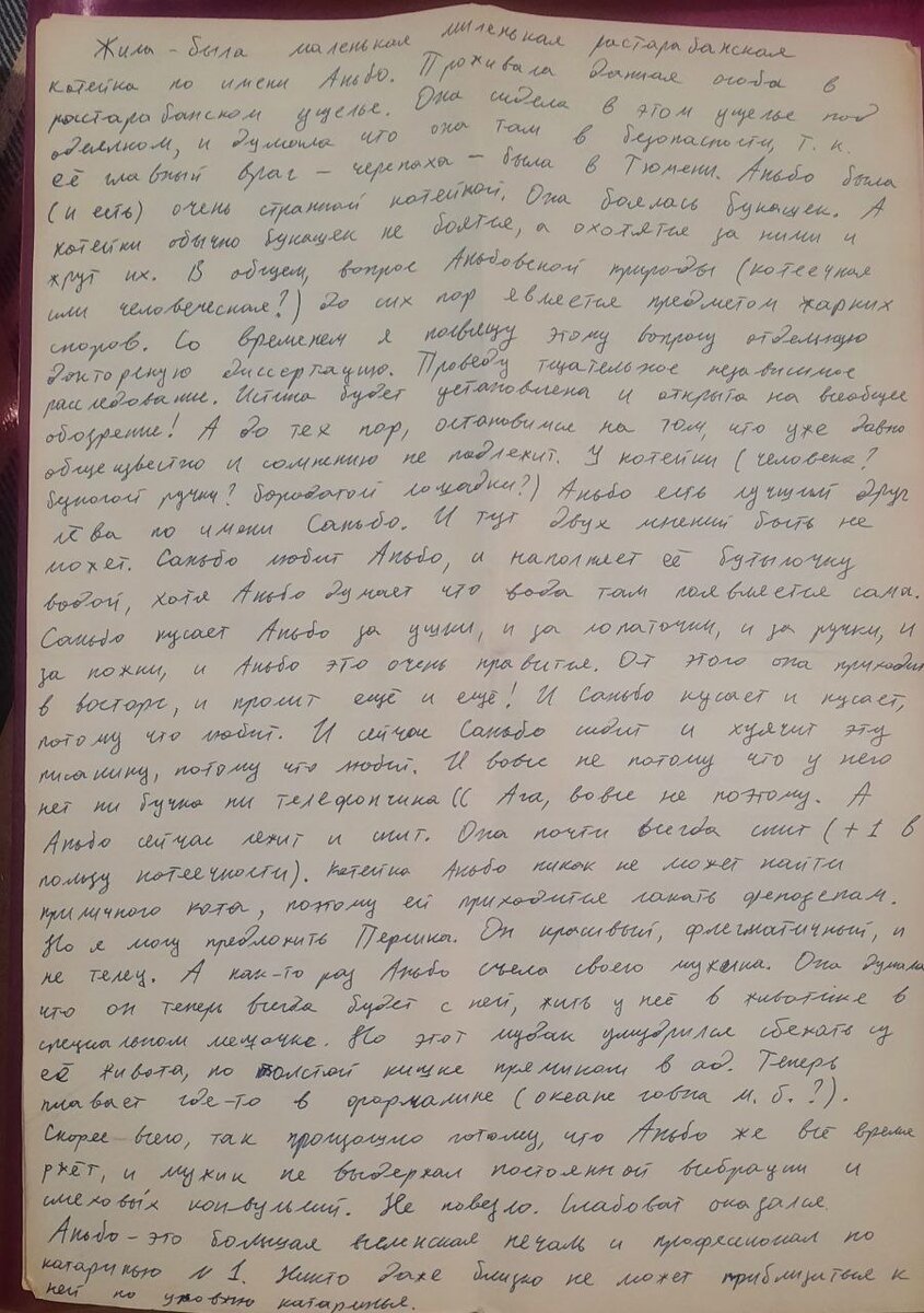 Жила-была маленькая миленькая растарабанская котейка по имени Аньбо. Проживала данная особа в растарабанском ущелье. Она сидела в этом ущелье под одеялком, и думала что она там в безопасности, т.к. её главный враг - черепаха - была в Тюмени. Аньбо была (и есть) очень странной котейкой. Она боялась букашек. А котейки обычно букашек не боятся, а охотятся за ними и жрут их. В общем, вопрос Аньбовской природы (котеечная или человеческая?) до сих пор является предметом жарких споров. Со временем я посвящу этому вопросу отдельную докторскую диссертацию. Проведу тщательное независимое расследование. Истина будет установлена и открыта на всеобщее обозрение! А до тех пор, остановимся на том, что уже давно общеизвестно и сомнению не подлежит. У котейки (человека? Безногой ручки? Бородатой лошадки?) Аньбо есть лучший друг лёва по имени Саньбо. И тут двух мнений быть не может. Саньбо любит Аньбо, и наполняет её бутылочку водой, хотя Аньбо думает что вода там появляется сама. Саньбо кусает Аньбо з