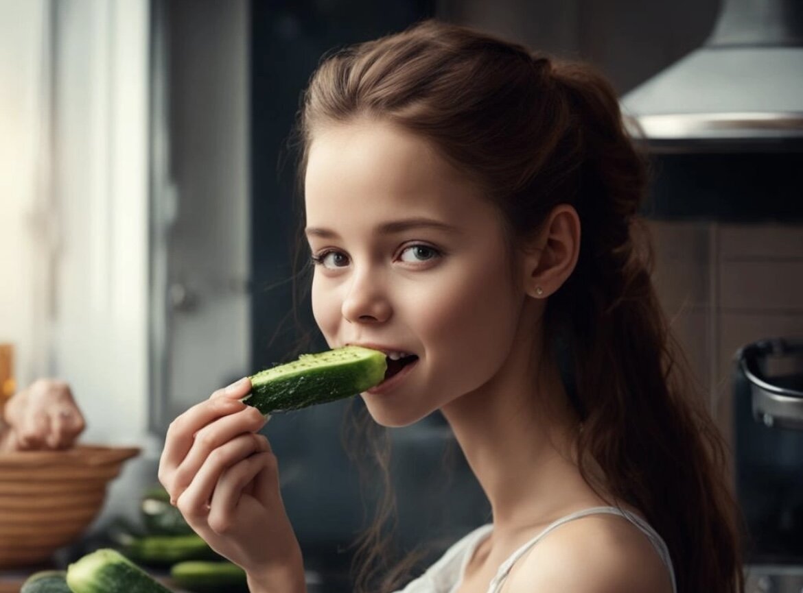 Она кинула в соседа долькой апельсина, который мужчина почистил, пока она была занята огурцом. Тот поймал дольку на лету и сунул её в рот.