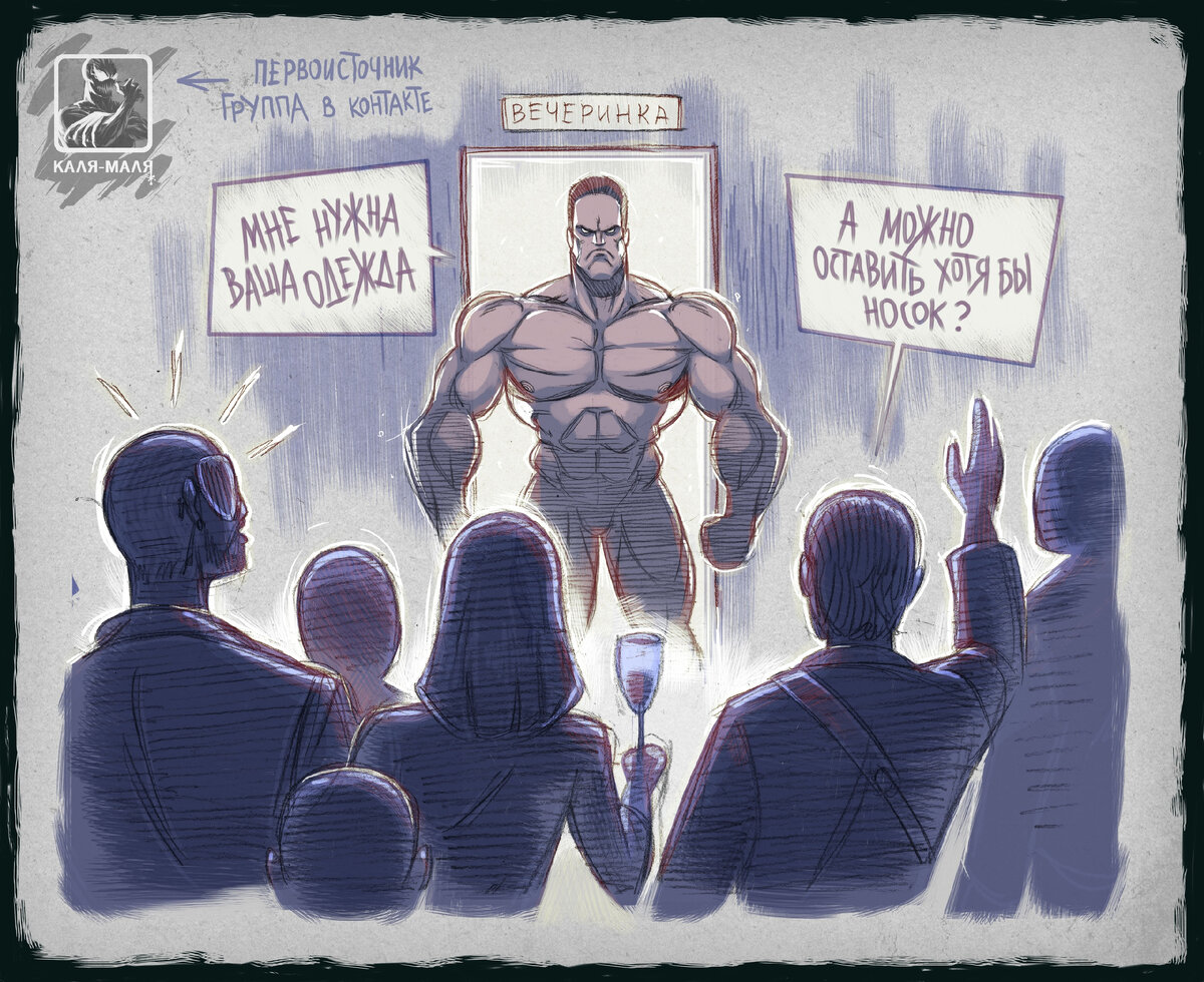 Знаю, что я немного припозднился с темой, озвученной в заголовке этой статьи, но, во-первых, в праздники я отдыхал, а во-вторых, мемы и комиксы на эту тему все еще продолжают выходить (некоторые зарисовки из этой подборки вышли совсем не давно), так что я подумал, почему бы не сделать такой материал. Тем более, как показывает практика, скандальные темы всегда набирают больше просмотров - вот и проверим, получится ли так же на этот раз. О самой вечеринке, думаю, вы и так уже много чего слышали, так что тут можно обойтись без длинных вступительных слов и сразу перейти к комиксам. Надеюсь, что они вам понравятся! Художник по имени Павел Михальцев - автора паблика КАЛЯ-МАЛЯ - озаглавил одну из своих недавних зарисовок «Терминатор на вечеринке у Ивлеевой». Кроссовер получился неожиданным, но удачным: знаменитая сцена из фантастического фильма о восстании машин отлично замиксовалась с нашумевшей новостью. Художник Артём Бизяев профессионально занимается комиксами - он рисовал такие серии как